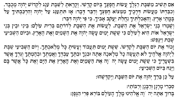 Им ташив ми-Шабат раглеха, асот хафацеха бе-йом кодши, ве-карата ла-Шабат онег, ликдош Адонай мехубад, ве хибадто ме-асот драхеха, ми-мцо хефцеха ве-дабер давар, - аз титъанаг аль Адонай, ве- ѓиркавтиха аль бамотей-арец, ве- ѓаахальтиха нахалат-Яаков авиха, ки пи Адонай дибер: «Ве-шамру вней-Йисраэль эт ѓа-Шабат лаасот эт ѓа-Шабат, ле-доротам, брит олам бейни у-вейн бней-Йисраэль от ѓи ле-олам, ки шешет-ямим аса Адонай эт ѓа-шамайим ве-эт ѓа-арец, у-вайом ѓа-швии шават ва-йинафаш». Захор эт йом ѓа-Шабат ле-кадшо. шешет-ямим таавод ве-асита коль млахтеха, ве-йом ѓа-швии - Шабат ла-Адонай, Элоѓеха; ло таасэ холь млаха ата, у-винха, у-витеха, авдеха, ва-аматха, у-в ѓемтеха, ве-герха ашер би-шъареха, - ки шешет-ямим аса Адонай эт ѓа-шамаим, ве-эт ѓа-арец, эт ѓа-ям, ве-эт коль ашер бам, ва-янах ба-йом ѓа-швии. Аль кен верах Адонай эт йом ѓа-Шабат ве-йекадшеѓу. Саври маранан! Барух Ата, Адонай, Элоѓейну, Мелех ѓа-олам, борэ при ѓа-гафен! |