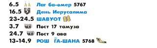Rosh Hashana 5768 Tamuz 17 Av 9 Lag Ba-Omer Yom Yerushalaim Shavuot Zom_10 Tevet Zom Gedalya Yom Kippur Simchat Torah Chanukka Succot