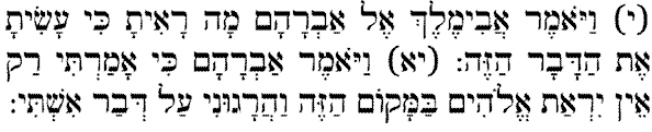 (10) И СКАЗАЛ АВИМЕЛЕХ АВРАЃАМУ: «ЧТО ИМЕЛ ТЫ В ВИДУ, КОГДА ТЫ ЭТО СДЕЛАЛ?» (11) И СКАЗАЛ АВРАЃАМ: «ТАК КАК Я ДУМАЛ – ТОЛЬКО НЕТ СТРАХА ПРЕД ВСЕСИЛЬНЫМ В ЭТОМ МЕСТЕ, И МЕНЯ УБЬЮТ ПО ПОВОДУ ЖЕНЫ МОЕЙ». (пер. П. Гиля).
