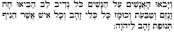 И ПРИШЛИ МУЖИ С ЖЕНАМИ: ВСЕ, ПОБУЖДЕННЫЕ СЕРДЦЕМ, ПРИНЕСЛИ ОБРУЧЬЯ, И КОЛЬЦА, И ПЕРСТНИ, И ЗАСТЕЖНЫЕ БУЛАВКИ, ВСЕ (ВИДЫ) ЗОЛОТЫХ УКРАШЕНИЙ, И ВСЯКИЙ, КТО ПРОВЕЛ ПРИНОШЕНИЕ (ИЗ) ЗОЛОТА Г-СПОДУ». (Ф. Гурфинкель)